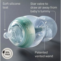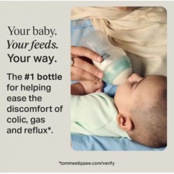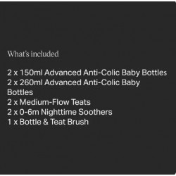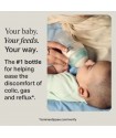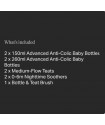 The Advanced Anti-Colic bottles feature a patented vented tube to reduce colic, gas, and reflux, while breast-like teats ensure a secure latch and minimal air intake for comfort.