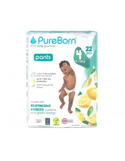 PureBorn Day Training Pants are crafted using naturally derived, safe, and responsibly sourced materials. They feature an FSC-certified wood pulp core and a soft top layer made from sustainably harvested corn and sugarcane. Dermatologically tested, vegan, and cruelty-free, these training pants provide up to 12 hours of dryness and are designed with a wider fit to ensure comfort and freedom of movement.