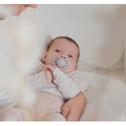 The Bibs pacifier features a symmetrical nipple for gentle, even oral placement, available in food-grade silicone. Made from BPA-free, safe materials, it has a wide, curved shield for a secure fit with less oral effort. Ventilation holes prevent moisture buildup, and an air valve helps the nipple shape naturally to the baby's mouth.