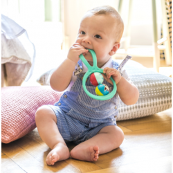 This teething rattle offers a multisensory experience: it stimulates hearing thanks to its bell, awakens touch thanks to different relief patterns, develops the sense of smell with its sweet natural scent.