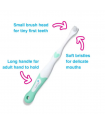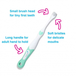 The tiny baby toothbrush head suits small mouths and first milk teeth. The soft bristles are gentle on delicate teething gums