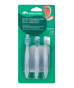 Slip onto the index finger and moisten with water to wipe the gums, first teeth and around the mouth.