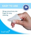 Slip onto the index finger and moisten with water to wipe the gums, first teeth and around the mouth.