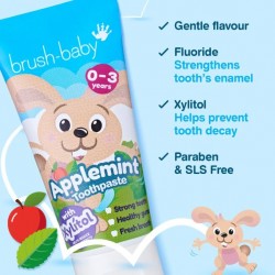 The brush-baby yummy applemint infant toothpaste is perfect for your little one because it tastes great! Just use a smear on your children’s toothbrush and you’re ready to go! It is safe for kids as it's SLS FREE, meaning it’s non foaming and is suitable for vegans and vegetarians! It also contains Xylitol which reduces sugar acids and fluoride which strengthens milk teeth enamel.