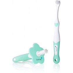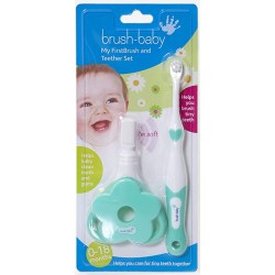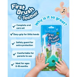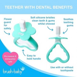 FirstTeether – Baby’s own teether with soft bristles to massage gums and clean first teeth. Easy to hold, safe with a flower guard, and can be used with a smear of toothpaste.